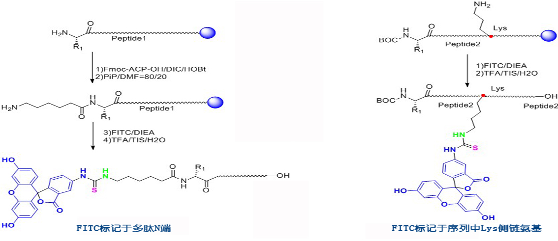 FITC標(biāo)記 FITC(異硫氰酸熒光素)具有比較高的活性,我們公司可以通過(guò)兩種方式將FITC標(biāo)記于多肽 上:(1) 將FITC標(biāo)記于賴氨酸(Lys)或被選擇性地脫保護(hù)的鳥氨酸(ornithine)側(cè)鏈氨基 上;(2) 將FITC標(biāo)記于多肽N端氨基。