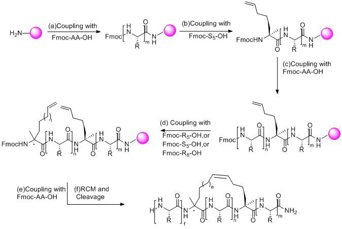 訂書肽的合成與普通多肽合成的區(qū)別在于在固相合成肽鏈過程中引入兩個(gè)含有α-甲基,α-烯基的非天然氨基酸,然后兩個(gè)非天然氨基酸之間發(fā)生烯烴復(fù)分解反應(yīng)環(huán)化構(gòu)成穩(wěn)定α-螺旋結(jié)構(gòu)構(gòu)象的全碳支架,進(jìn)而合成訂書肽。